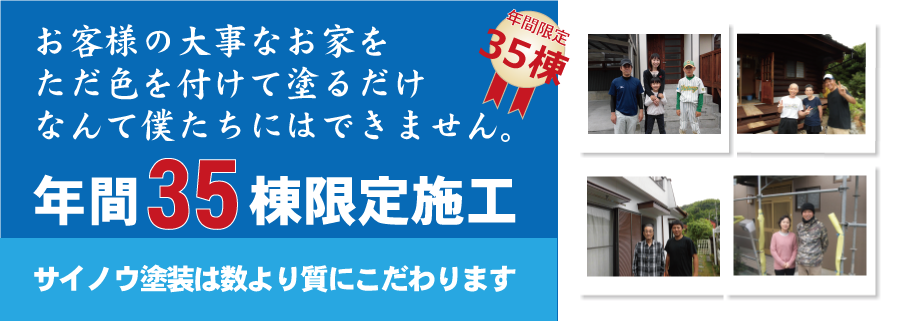 塗装業界でもめずらしいと思いますが、サイノウ塗装では年間塗替え棟数を35棟限定にしています。クオリティを維持するには年間この棟数が限界です。